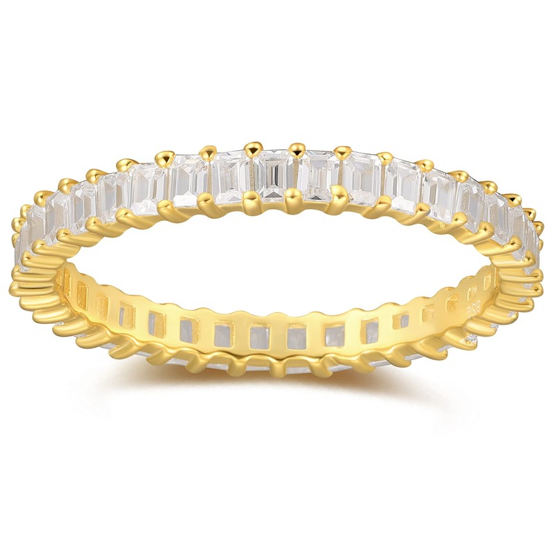 - A continuous circle of 1.5 x 2mm emerald-cut cubic zironica stones in a setting prong gives this eternity ring a modern sophistication. Stones are not glued in, they are set in the metal just like fine jewelry. Works beautifully as a wedding ring or anniversary gift. Add it to a stack of other eternity rings for an on-trend right hand look.