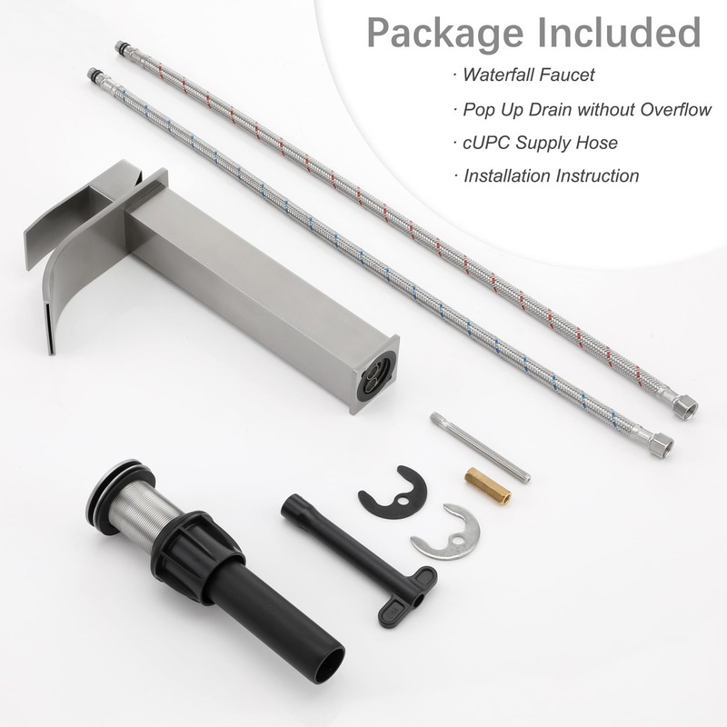 - √ PACKAGE INCLUDED √: This nickel bathroom faucet kit included the faucets for vessel sink, pop up drain without overflow and cUPC 9/16 supply hose length 24 inches, all mounting hardware included, if you have any questions about your use or installation, please contact us promptly.