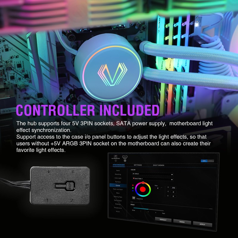 - Controller Included: The controller included in the accessory bag, you can achieve ARGB sync and PWM with it. Max. Air Flow: 52CFM; Noise Level: 30.8dB(A), Fan Speed: 800-1800 RPM.