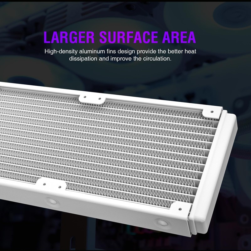 - Better Cooling Performance: With a more efficient cold plate, spraying copper bottom, proprietary pump and fans optimized for static pressure to make sure the excellent heat transfer from cpu.