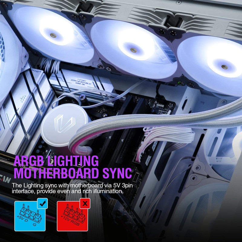 - Addressable RGB Sync: The Addressabe RGB lighting on the fans and pump can sync with motherboard via 5V 3pin interface, provide even and rich illumination.