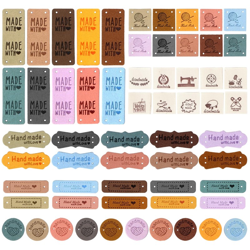 VEUWOLM Pack of 120 Handmade Labels, Handmade Leather Labels Made of Suede with Holes Embellishment Knitting for DIY Jeans Bags Hat Craft Knitting Crochet (6 Styles, 20 Pieces for Each Style)