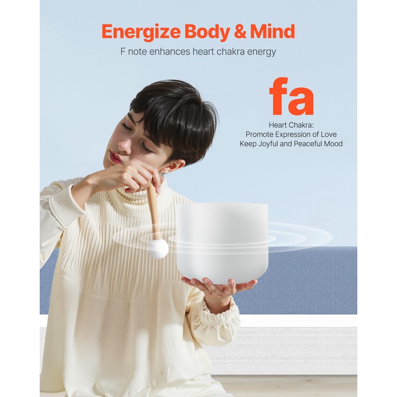 - Find Your Inner Peace: The 8-inch crystal singing bowl resonates with the F note, stimulating and balancing the heart chakra to promote body-mind harmony. The sound vibrations penetrate your body, resonating with internal cells, tissues, and organs, relaxing your body and mind through sound therapy.