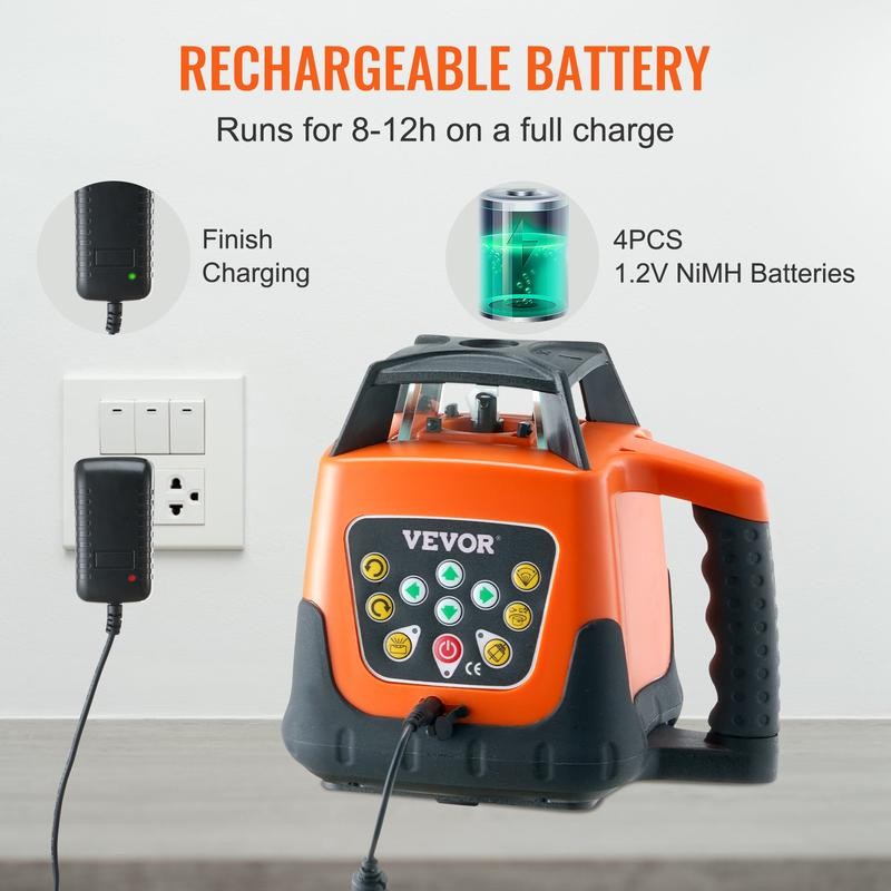 • Rechargeable Battery: Are you ready to dive into power? Our level laser tool is powered by 4PCS 1.2V NiMH batteries that run for 8-12 hours on a full charge (including charger), ensuring that you'll be able to complete your tasks efficiently without the need to frequently recharge or replace batteries when things matter most.