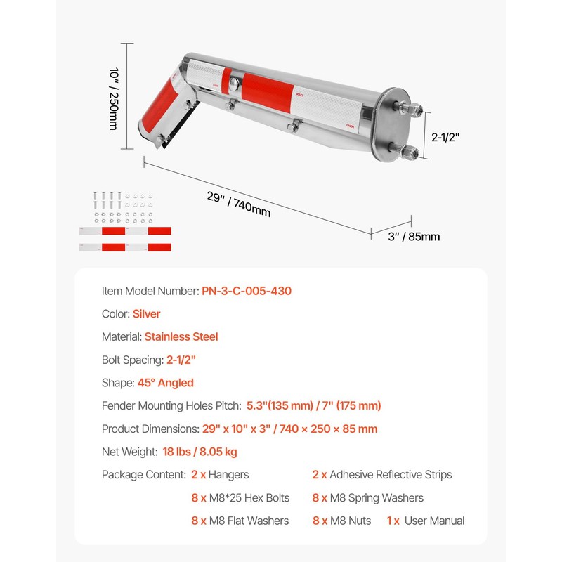 VEVOR Stainless Steel Angled Spring Loaded Mud Flap Hangers, 2-1/2" Bolt Spacing Mudflap Hangers for Semi Trucks, 1 Pair Heavy Duty Semi Truck Mud Flap Hanger Set with Reflective Strips, Silver