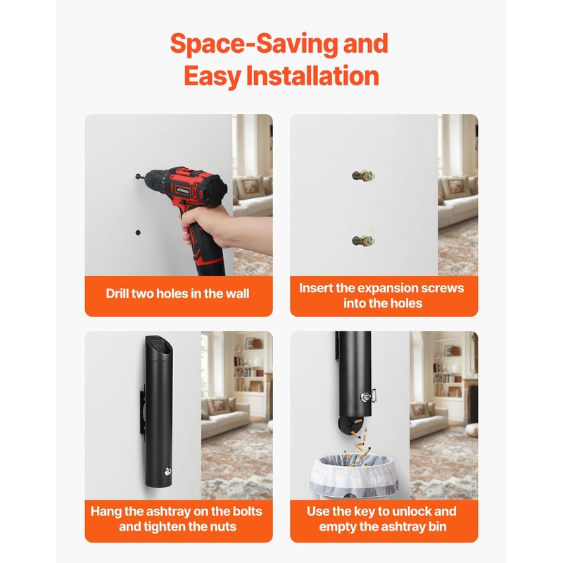 - Compact Wall-Mounted Design: The wall-mounted design saves space, making it ideal for tight spaces. It’s easy to install by simply drilling holes in the wall, offering both a practical and aesthetically pleasing solution for your cigarette disposal container.