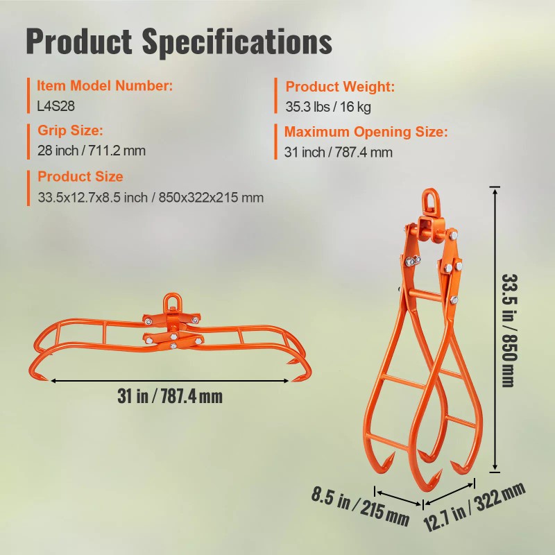 - Large Opening Size: With a 31" max opening and a 28" gripping size, our timber claw hook is perfect for lifting and moving large logs. They can also be used for handling hay stacks, cables, stones, and other items. Get the heavy-duty lifting job done efficiently!