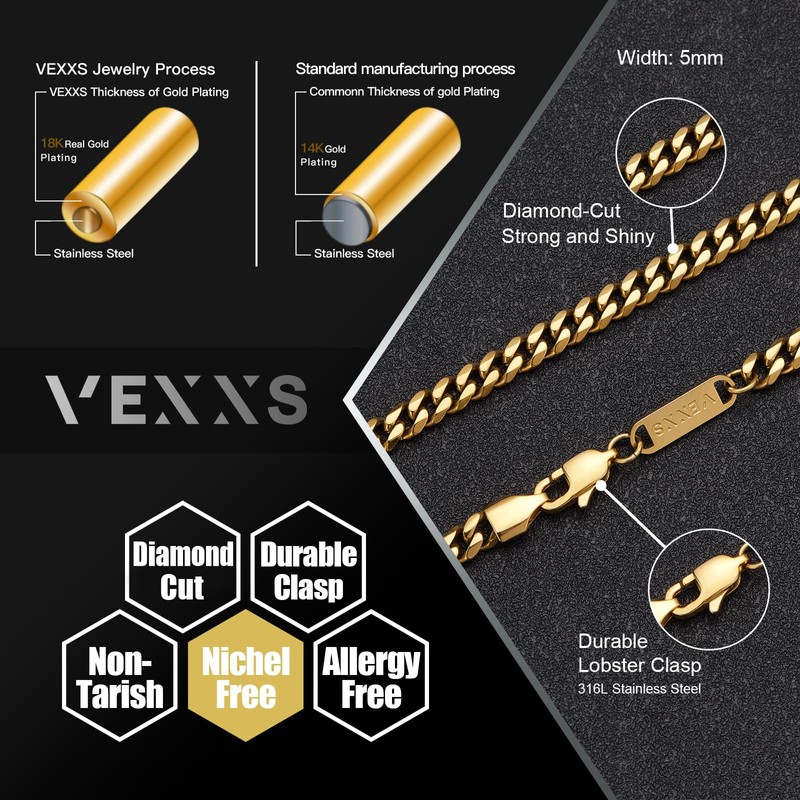 - 【6 Sides Diamond-Cut Gold Chain】VEXXS Diamond Cut gold chains adopt double electronic PVD Plating and delicately polishing for an everlasting shine. High-tech made, no color fading necklace for men.