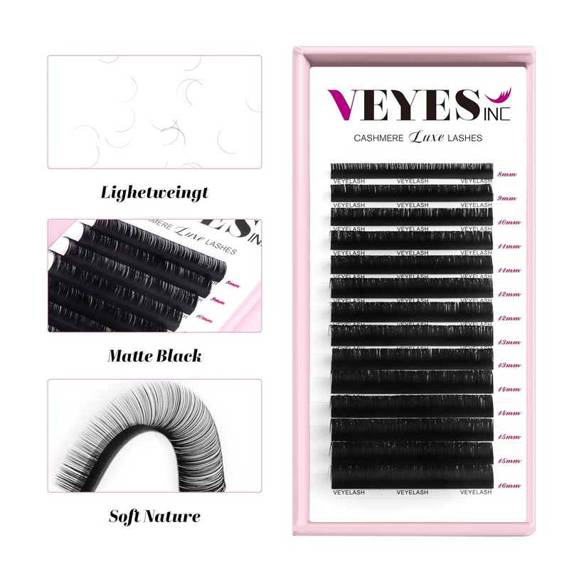 VEYES INC Cashmere Luxe Lashes - Tapered Tips Volume Lash Extension Trays B/C/CC/D/M/J Curl, 0.03-0.05, 8-17mm | Matte Black Professional Eyelash Supplies for Lash Techs (0.05 D 12mm)