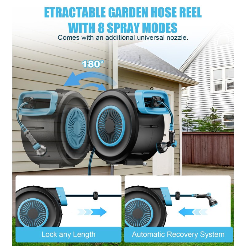 - 9 Adjustable Spray Patterns: Our retractable garden hose reel comes with a 9-pattern hose nozzle (jet, soaker, angle, flat, cone, shower, center, rinse, mist) , Whether you're watering delicate flowers, cleaning your car, or washing your driveway, the hose provides the perfect water flow for every task.