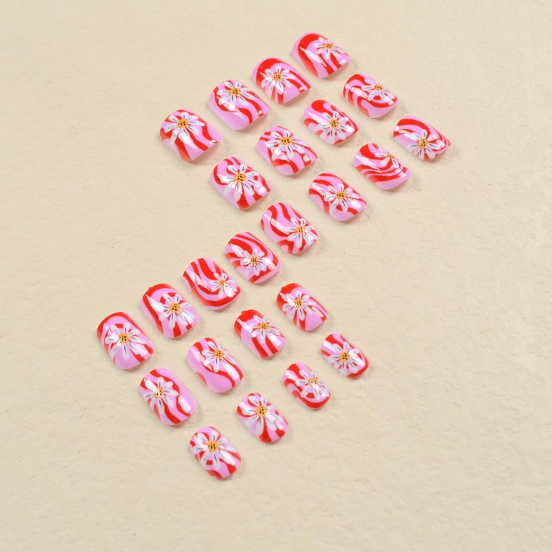 Vezocim Press on Nails Short Square, 24Pcs Pink Artificial Fake Nails with Red Line Flower Designs, Glossy Full Cover Acrylic False Nails Glue Fingernails with Charm for Women