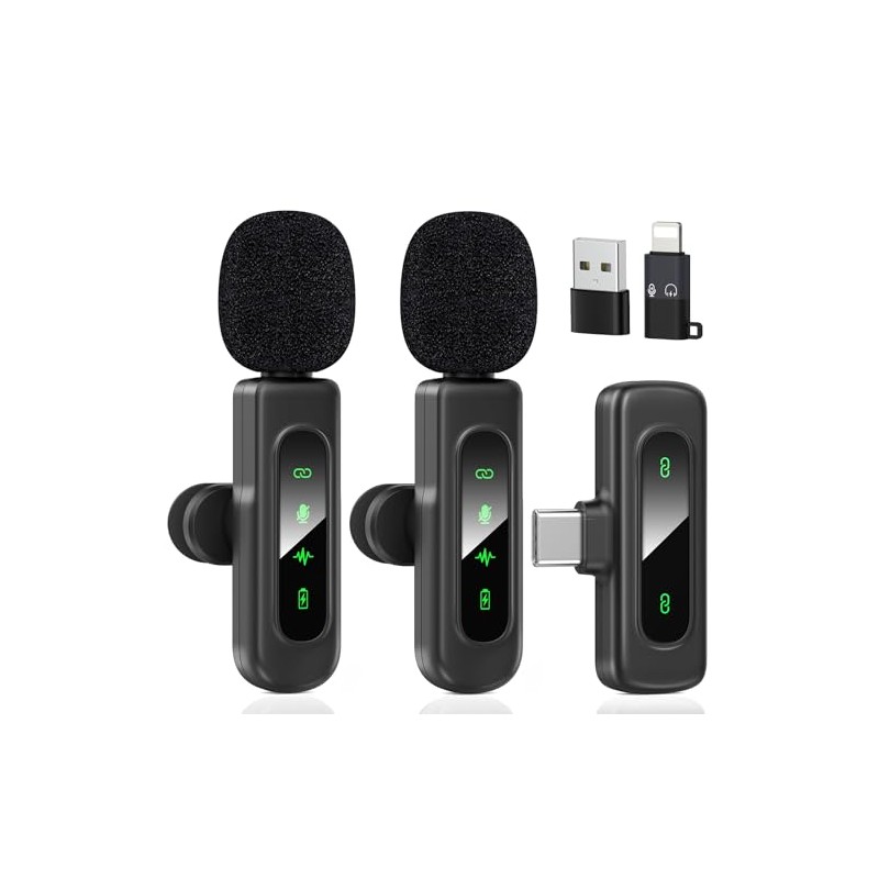 - What You will Get:2*Wireless Lavalier Microphone, 1* Microphone Receiver, 1* USB C to Lightning Adapter, 1* USB C Charging Cable,1*Tc to Usb Adapter1* User Manual, 2* Foam Mic Covers, 2* Mic Furry Windscreen Muff.