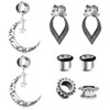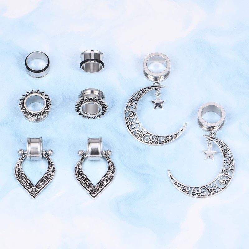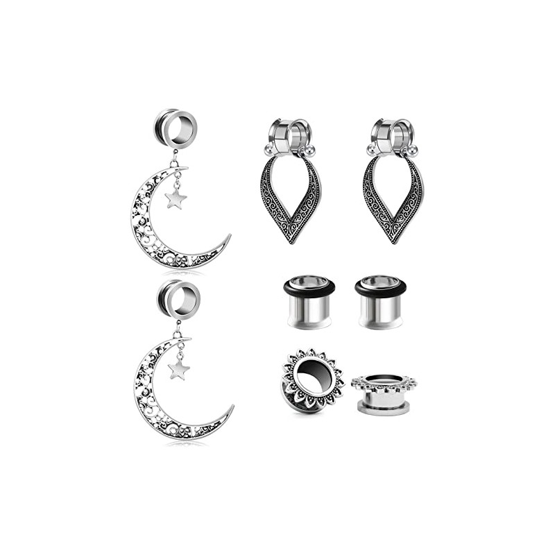 VF VFUN 4 Pairs of Ear Tunnel Plugs Surgical Steel Dangle Pendant Moon Heart Double Flared Ear Expander Ear Piercing Jewellery 6-16 mm, Stainless Steel