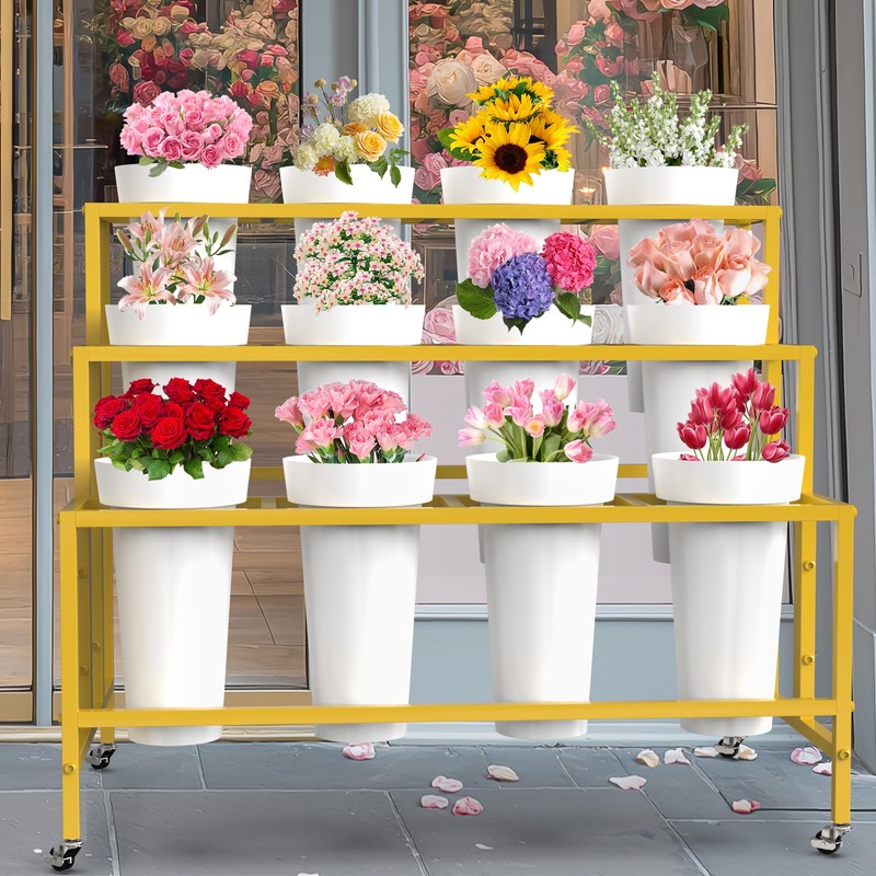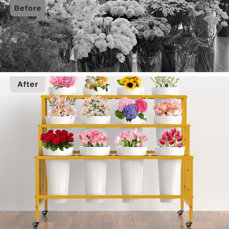 - Flower Display Stand with Buckets: 3 layers flower display stand equipped with 12 round flower buckets to set your flowers or plants. The gold flower bar stand planter display rack adopts a three-layer ladder structure, freestanding open design will not block sunlight from each other and easy to fertilize and water, helping florals or plants obtain sufficient sunlight in a comfortable environment to promote growth.