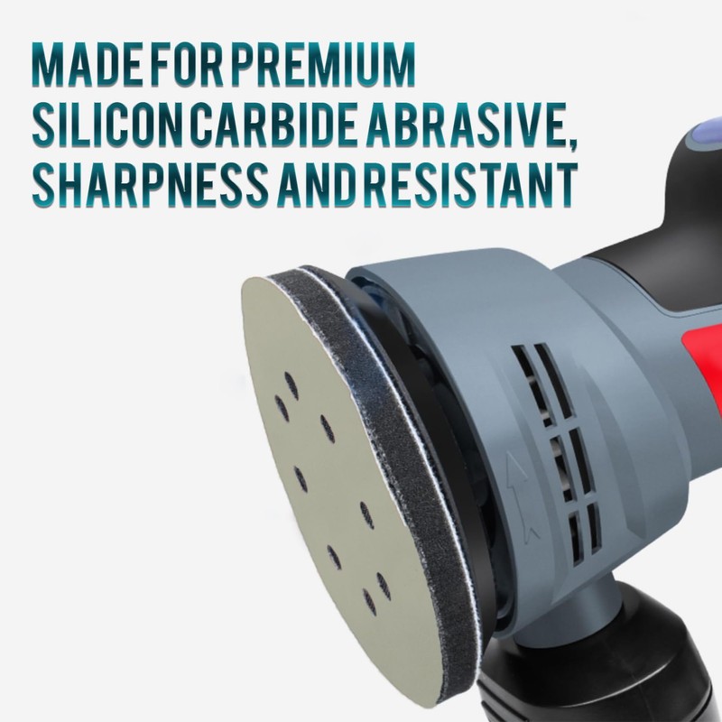 - 【5 Inch 8 Holes Sanding Pads】Hook and loop round sanding discs 5 inch with 8 holes new added, making it not easily blocked. Sand paper is made for premium silicon carbide abrasive, which have hard sharpness and high quality flocking on the back, sufficient adhesion, resistant to sanding, anti-static.