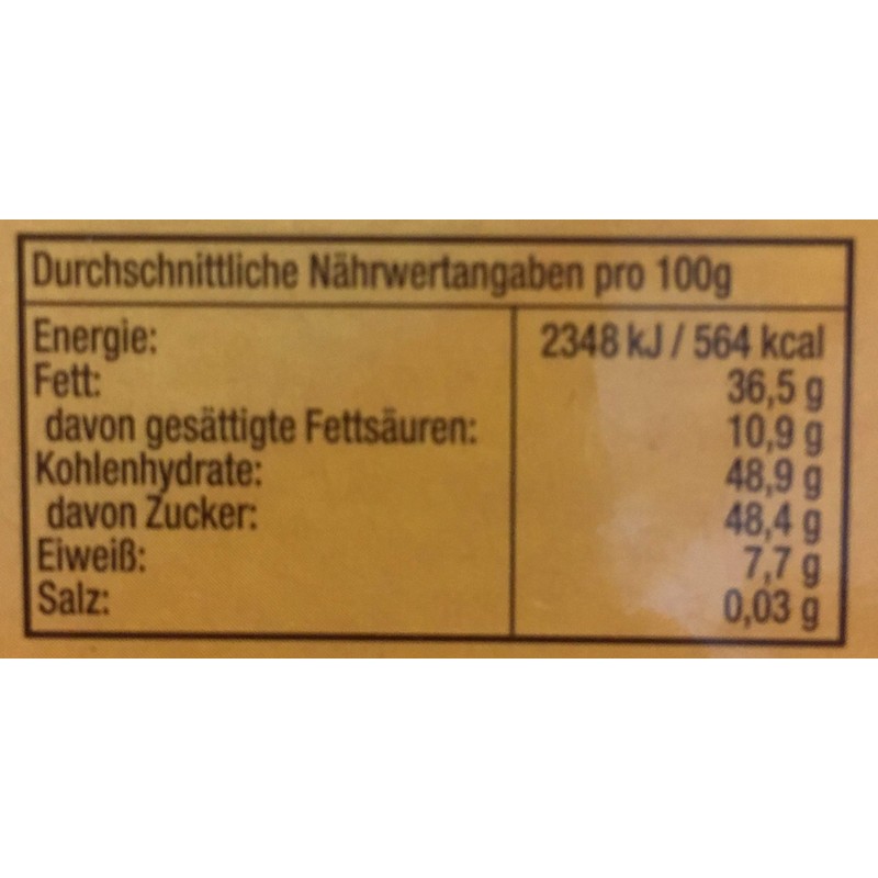 - Ingredients: sugar, roasted hazelnuts (34%), cocoa butter, cocoa mass, whole milk powder, emulsifier: soy lecithin bourbon vanilla. May contain traces of peanuts, peel fruits (nuts and almonds) and gluten-containing cereals. Nutritional information per 100 g: calorific value 564 kcal/2348 kJ, fat 36.5 g, of which saturated fatty acids: 10.9 g, carbohydrates 48.9 g, of which sugar 48.4 g, protein 7.7 g, salt 0.03 g