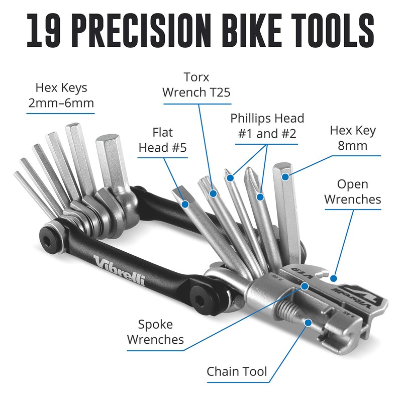 - 19 Precision Tools: Hex (2, 2.5, 3, 4, 5, 6, 8), Universal Chain Breaker Tool, Spoke Wrenches (M7, M9, 3.3mm, 3.45mm), Open Wrenches (8mm,10mm) Phillips Screwdrivers (#1,#2), flat (#2), Torx (t-25), With Non-Slip Sidebar Grips.