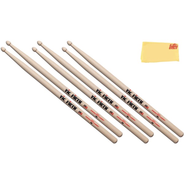 Vic Firth American Classic 2B Drumsticks - 3-Pack Bundle with Austin Bazaar Polishing Cloth