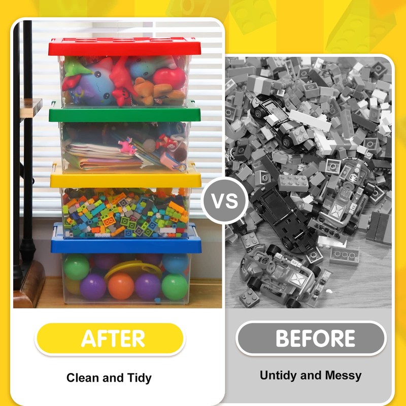 - Full of Childlike Design: the lid of plastic bin toy organizer is designed in the shape of brick, which is suitable for children who love building blocks; The lids of 4 containers are blue, red, green and yellow, and these classic building brick colors will have one of your child's favorites