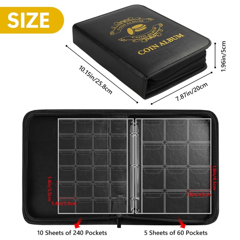- 【35x35mm & 45x45mm coin collection pockets】The coin collection album with zipper has 15 pages, 10 of which are suitable for coins within 35 mm in diameter, and 5 pages are suitable for coins within 45 mm in diameter. It can easily store coins of 2 pounds and 50 pence, and 300 pockets meet your coin collection needs.