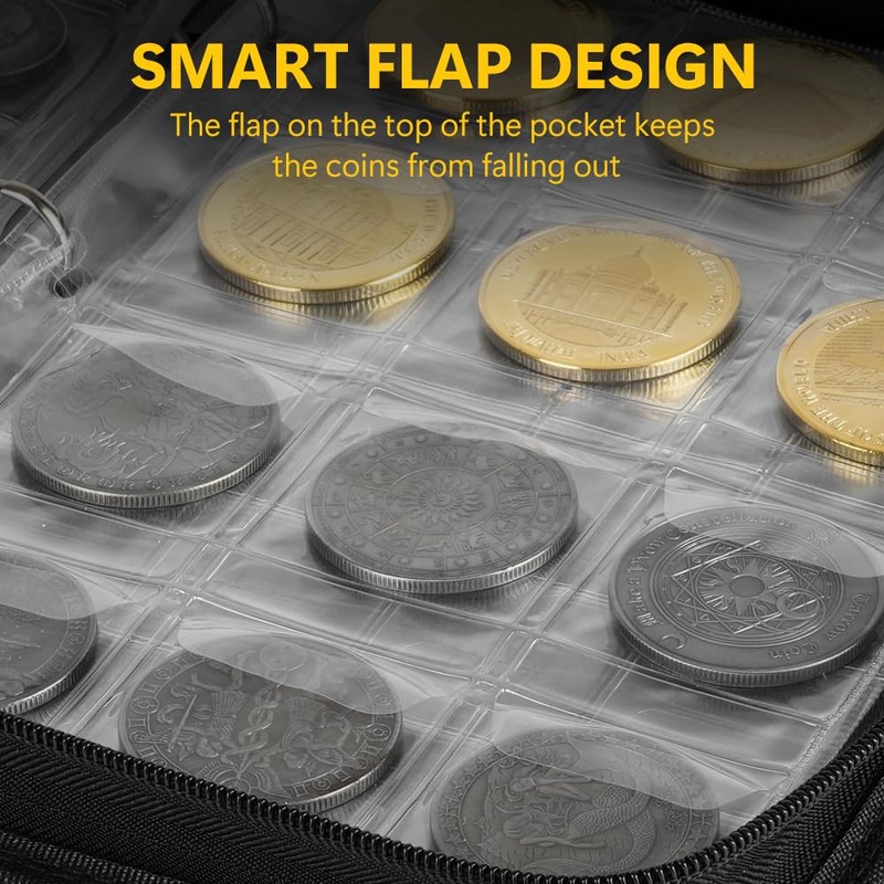 - 【Double protection of zipper and anti-drop cover】The top of each pocket of the coin book has an anti-drop cover to prevent coins from slipping. The pocket design can prevent the coins from colliding and scratching each other. The zipper protects the coins so that they will not fall out even if they are placed upside down, providing the most comprehensive protection for your collection coins.