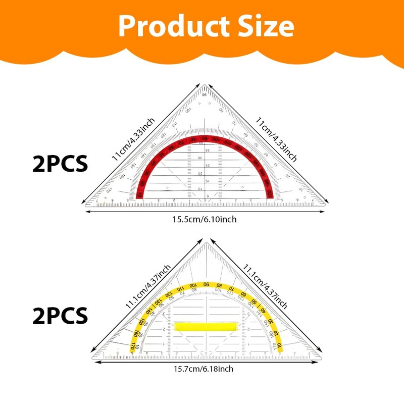 • High-quality material: the triangular ruler is made of high-quality PS plastic material, which is characterised by strong toughness, high strength, not easy to break, smooth surface, clear scale and accurate measurement. Perfect for school, education, learning and daily work.