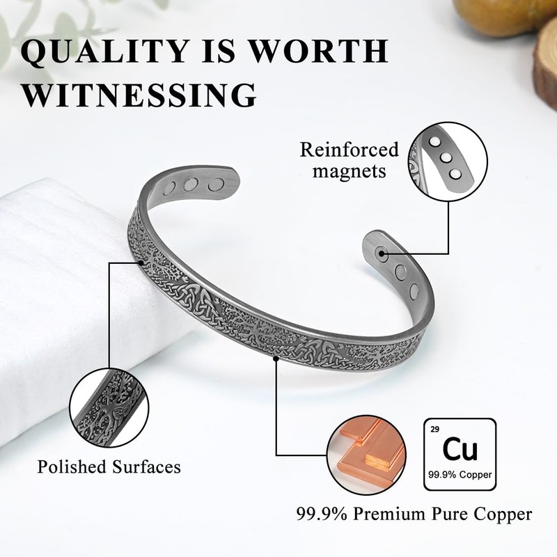 - 💯 100% Pure Copper Bracelet 💯 Made with high-quality pure copper. 100% LEAD & NICKEL FREE. Comfortable and durable, top techniques, Scratches Resistant. This copper magnetic bracelet have an elegant plated (PVD) finish and you won’t have to worry about tarnishing or skin irritation!