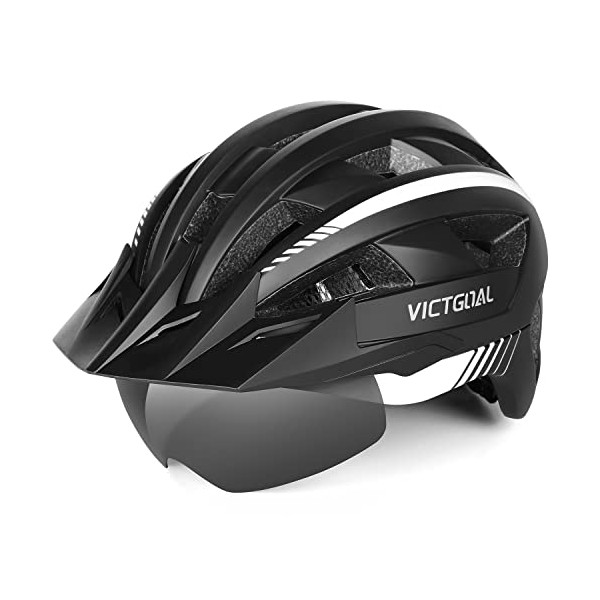 VICTGOAL Bike Helmet for Men Women with Led Light Detachable Magnetic Goggles Removable Sun Visor Mountain & Road Bicycle Helmets Adjustable Size Adult Cycling Helmets (M: 54-58 cm, Black White)