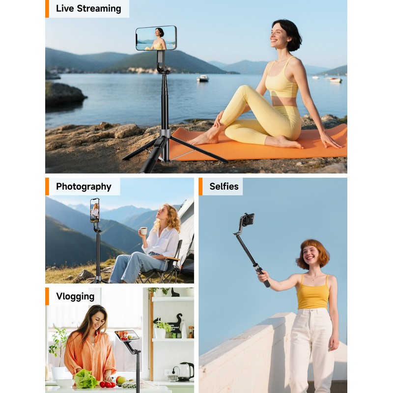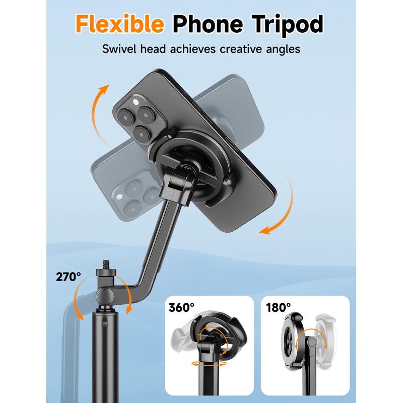 - 70" Flexible Tall Phone TripodExtendable cell phone tripod with a telescoping design provides height adjustment from 21inch to 70inch for customized photography setups. Thanks to its 3-Axis flexible adjustments, 270 vertical tilt neck for effortless overhead shots, high-angle and low-angle shots. And Adjustable tripod head with 180& 360 horizontal rotation enable seamless, full-circle framing from any angle