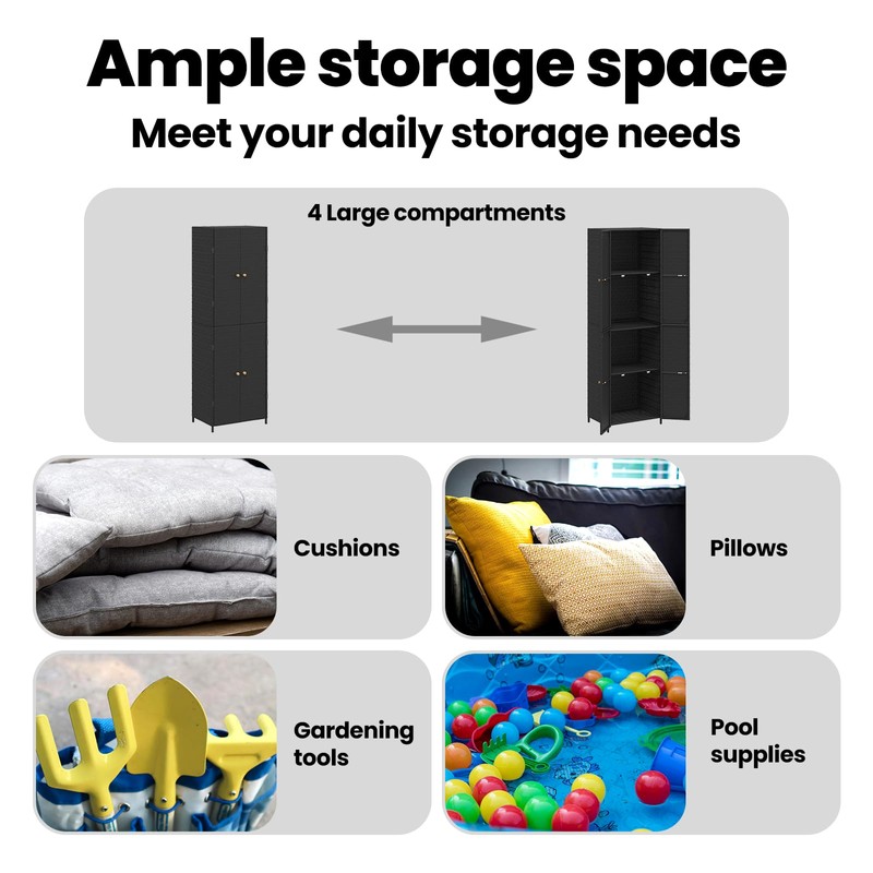- 【Water-resistant Design】: Manufactured with a water-resistant material, this garden storage cabinet can withstand humidity and rainy weather. It is easy to clean too