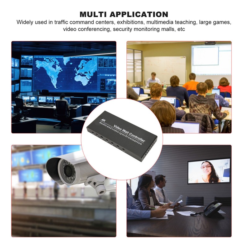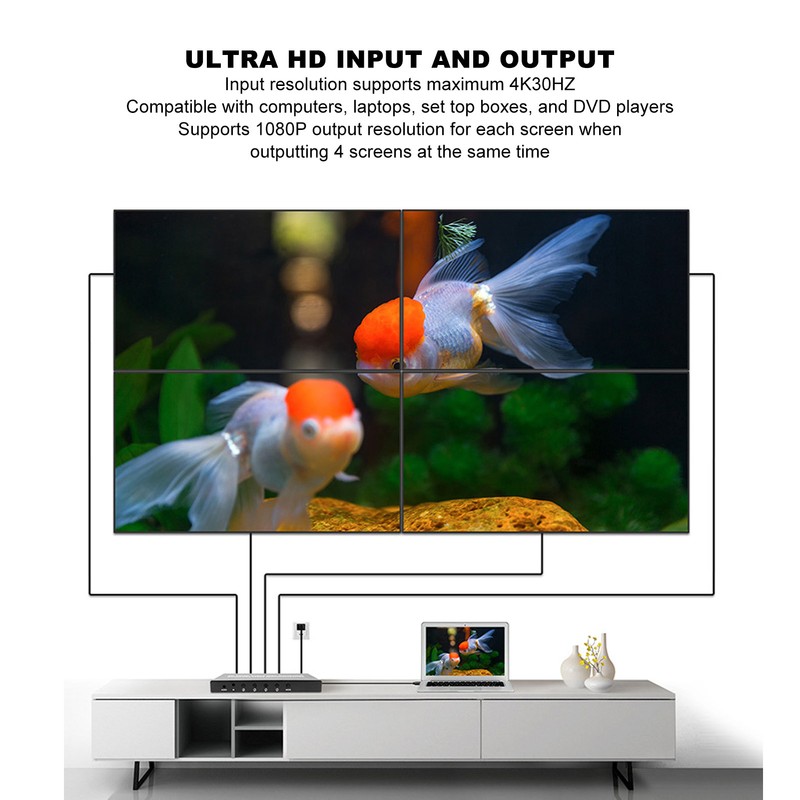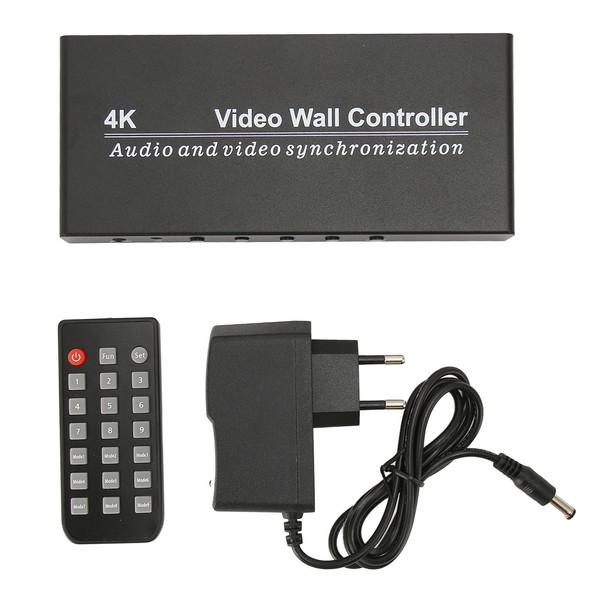 1、[9 Mode] 2x2 video wall controller that allows you to create large format video wall and digital signage displays through LCD splicing screens. Choose from 9 display modes: 1x1, 1x2, 1x3, 1x4, 2x1, 3x1, 4x1, 2x2, 2x2 rotation (180º image rotation). Supports providing 180° image rotation independently on all outputs. 2、[Easy To Install And Operate] The video wall controller is easy to use, plug and play, no drivers required. A remote control is provided for you to control it easily, or you can just press the buttons on the controller. Please use premium HD Multimedia Interface cable. 3、[Ultra HD Input And Output] Input resolution support maximum 4K30HZ, compatible with computer, laptop, set top box, DVD player. Support 1080P output resolution for each screen when outputting 4 screens at the same time. 4、[Independent Sound Setup] The video wall processor has a separate 3.5mm sound port for connecting to external speakers, cabinets, amplifiers and more. Powerful sound, supports PCM2, 5.1, for Dolby 5.1, DTS5.1 sound formats. 5、[Working Principle] 4K video wall controller, the complete HD Multimedia Interface image signal is distributed into 4 blocks and assigned to 4 video display units (such as rear projection units, LCD TVs, etc,) for splicing and displaying to form a large dynamic image screen. 6、[Multi Application] The video wall splicer allows you to enjoy high definition visual effects. Widely used in traffic command centers, exhibitions, multimedia teaching, large games, video conferencing, security monitoring malls and other places.