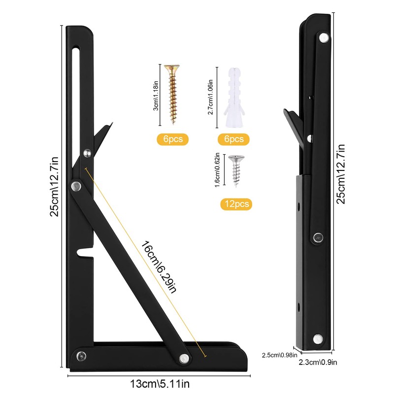 - Easy to install: They are very easy to install and fold, so you can build a folding shelf bracket or a small wall-mounted folding table for your home or garage. It can be installed on any type of wall without damaging the wall. Includes 6 high quality stainless steel screws and 6 expansion tubes.