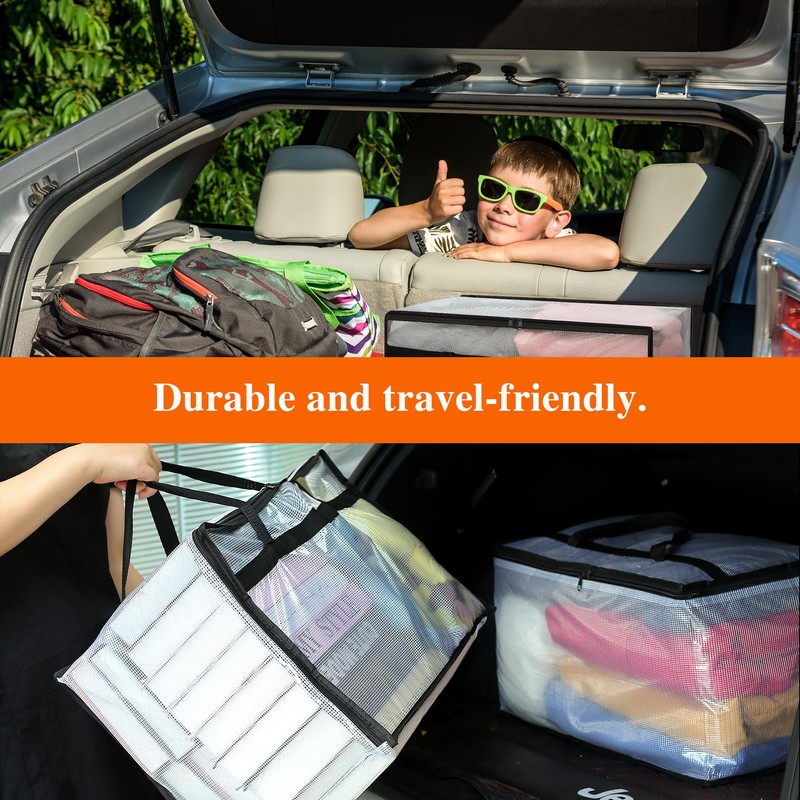 Wenn sie nicht gebraucht werden, lassen sich die Taschen vollständig flach zusammenfalten. Perfekt als durchsichtige Packwürfel auf Reisen, Bettwäscheaufbewahrung bei Saisonwechseln oder Garn-Organizer für Bastelutensilien. Geeignet für Schlafzimmer, Studentenwohnheime, Keller, Dachböden, Wohnmobile und mehr.