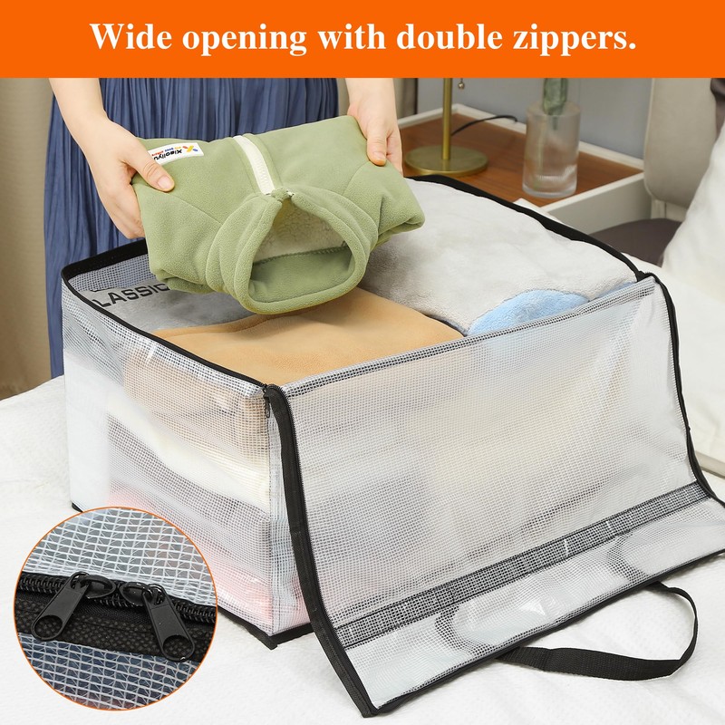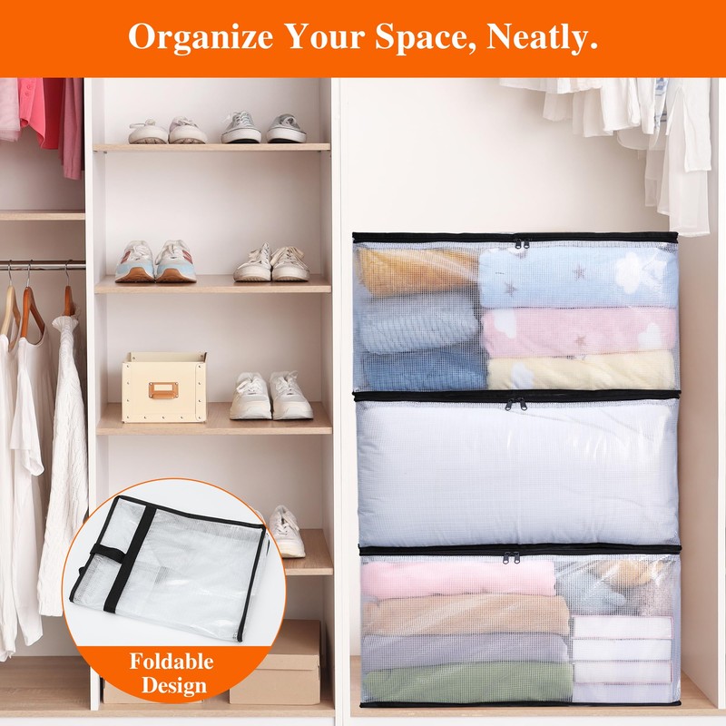 Mit den Maßen von 55 x 35 x 31 cm bieten diese Decken-Aufbewahrungstaschen ausreichend Platz für bis zu 30 T-Shirts, voluminöse Decken, Bettdecken, Kissen, Spielzeug oder Weihnachtsdekorationen. Das verstärkte, klare Netzmaterial ist reißfest, wasserdicht und ermöglicht jederzeit den direkten Blick auf den Inhalt – kein Kramen in Boxen mehr nötig.