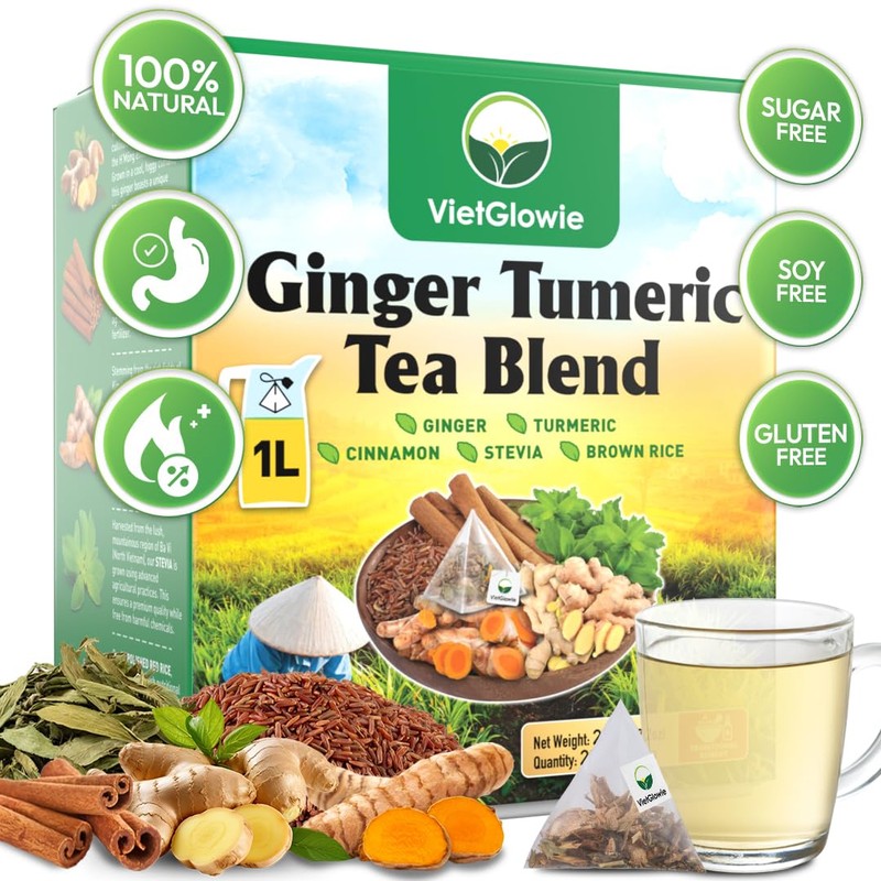 VietGlowie 20 Ginger Tumeric Tea Blend, 10.2g/bag to 33oz, Ginger, Turmeric, Cinnamon, Stevia, Brown Rice Tea Bags, Support Digestion, Boost Immunity, 100% Natural, No Sugar, No Caffeine, No Gluten