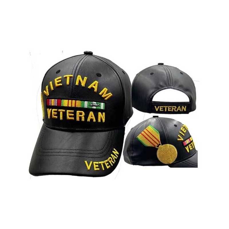 Vietnam Veteran Medallion Black Cap Hat Premium Quality PU Leather