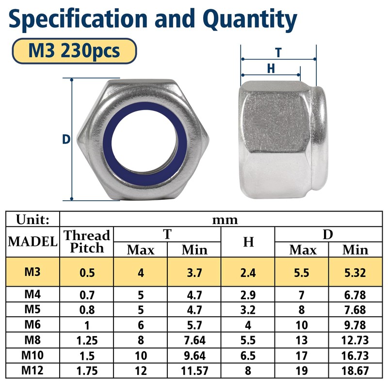- Contenido del paquete: 260 piezas de tuercas de bloqueo de nailon inoxidable M3 304 (18-8).