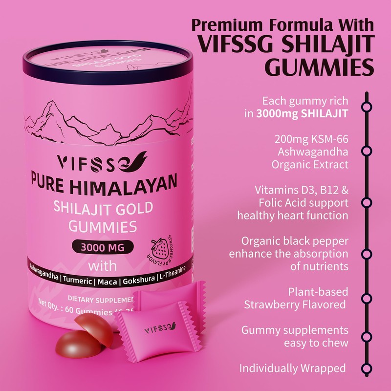 - [Strawberry flavor, Vegan, Gelatin Free]- Strawberry flavor shilajit supplements extracted from natural Strawberry, suitable for vegetarians, natural fruit flavor, soft in the mouth, and easy to chew, gummy supplements taste better than capsules, pills, and powders. Each bottle of VIFSSG shilajit gummies made of 60 vegan, all natural, non-GMO & gluten-free gummies.