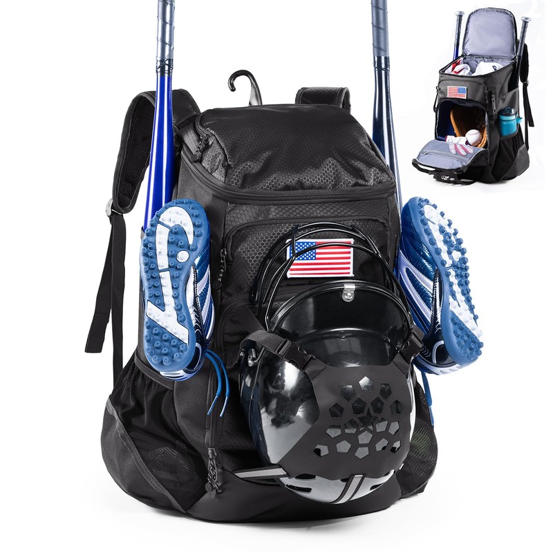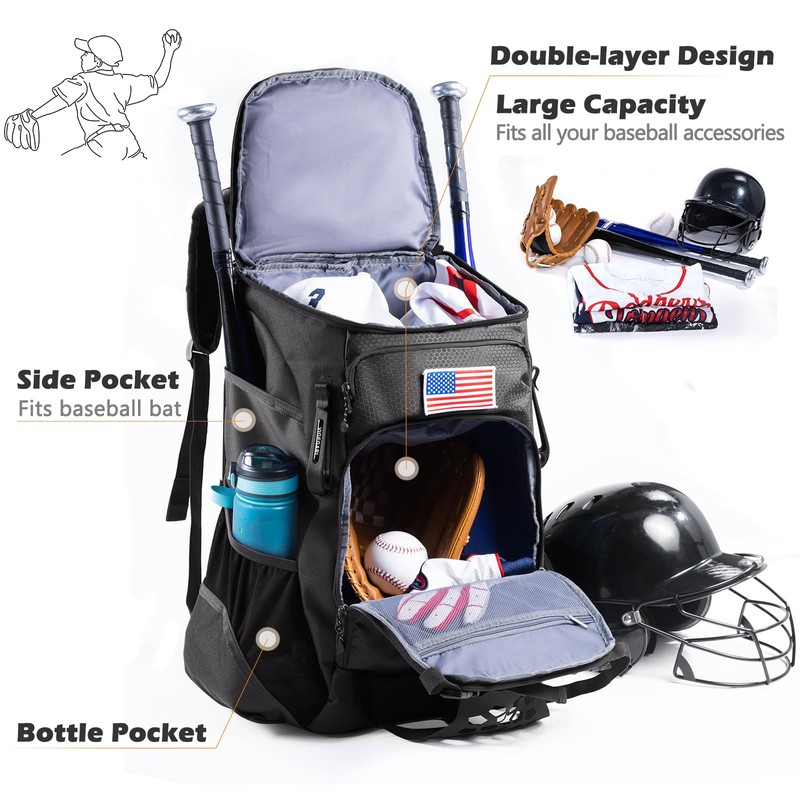 - Double-layer & Large Capacity - The advanced feature of the baseball bag is a double-layer design with TWO spacious compartments. It can comfortably accommodate all your baseball, T-ball, & Softball equipment, accessories, and essential gear. Dedicated areas to keep clean and wet items separate, ensuring better organization.