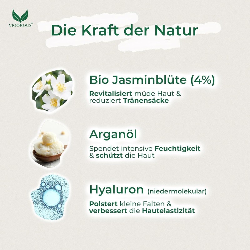 Discover the refreshing power of organic jasmine with the Vigorous® Jasmine Ointment Eyes, a specially developed eye cream designed to reduce dark circles, puffiness, and visible signs of fatigue around the eyes. This active jasmine-infused formula works deeply to refresh and rejuvenate the delicate eye area, making it an ideal daily solution for both men and women seeking smoother, more youthful-looking eyes.