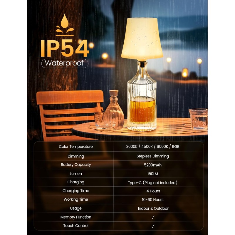 - [IP54 Wasserdicht] Die wiederaufladbare Tischlampe Kabellos ist nach IP54 wasserdicht und wird mit einer Silikondichtung geliefert, die den Tpye-C-Ladeanschluss unter dem Schirm sch??tzt und wasserdicht ist, so dass Sie sie im Innen- und Au?enbereich verwenden k?nnen, ohne sich Gedanken ??ber Regen oder Spritzer zu machen
