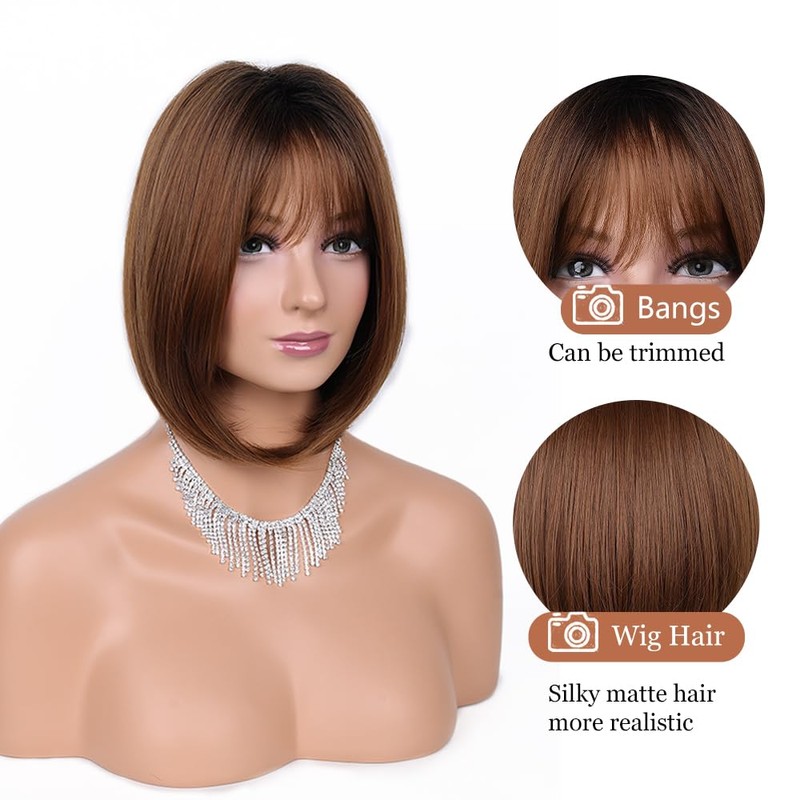 VIIYEESS Brown Bob Wigs for Women Mixed Brown Straight Layered Wig with Bangs Shoulder Length Natural Synthetic Short Hair Wig for Daily Party Use