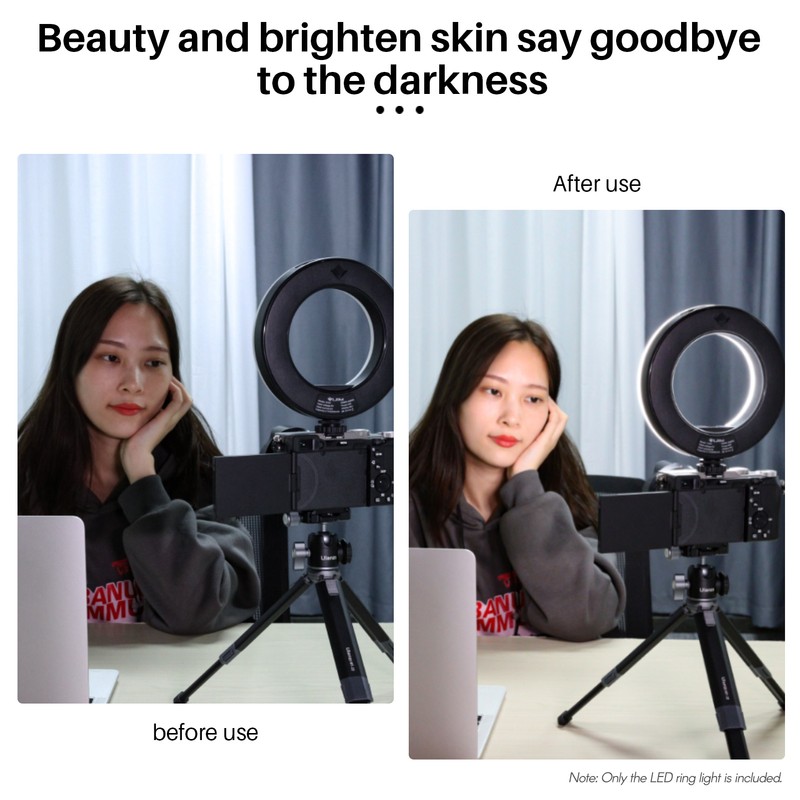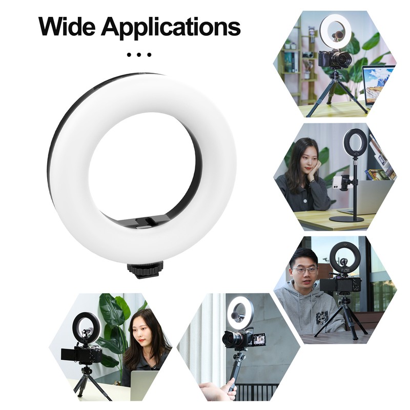 1、【High-Quality LED Ring Light】6 inch compact size design, adopts 64pcs high-quality lamp beads, 95+ CRI, smooth and even light make your skin tone more natural. 2、【Adjustable Color Temperature \u0026 Brightness】3 lighting modes(warm light/soft light/cold light), color temperature range from 3200K to 5600K, and 0%-100% adjustable brightness, meet all your needs in different usage conditions. 3、【Built-in Rechargeable Battery】Built-in 3.7V 2000mAh lithium battery, which can be recharged via the included USB cable, no need to worry about power issues when shooting outdoors.