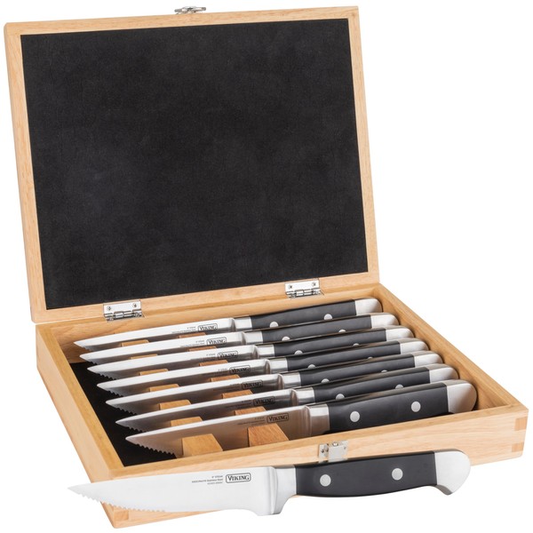 Viking Steak Knife Set, 8 Piece Stainless Steel Kitchen Knives Set with ABS Polymer Handles, Includes Wooden Gift Box, Hand Wash Only, Black