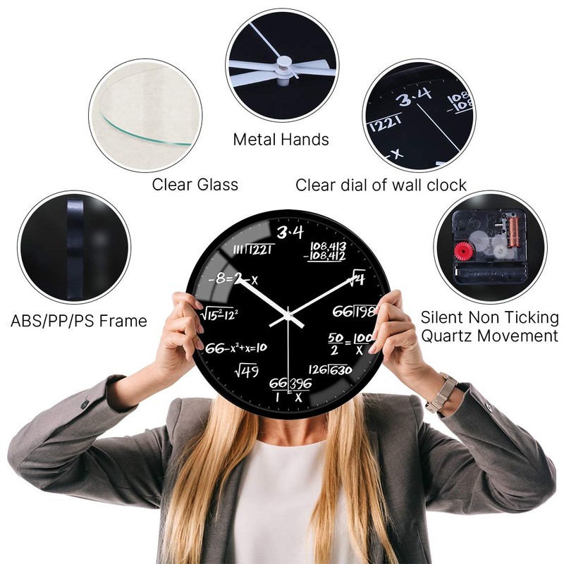 VIKMARI Glass Wall Clock 12 Inch Math Teaching Style Clock Black Battery Operated Quartz Silent Non Ticking Wall Clocks for Classroom Bedroom Study Room