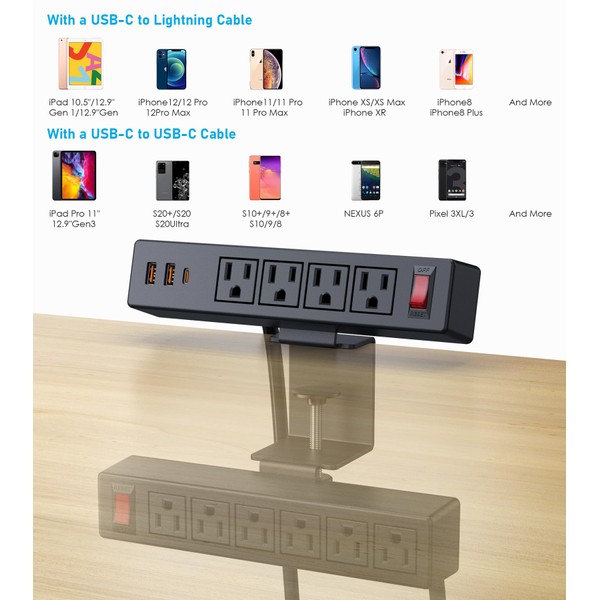 - 【13-in-1 Desk Clamp Power Strip】 - This dual desk-edge clamp power strip features two independent switches, 10 AC outlets (125V/12A/1500W), and 3 USB ports, including a 20W USB-C fast-charging port. With the ability to charge up to 13 devices at once, this power station helps save time and provides versatile charging options for all your needs.