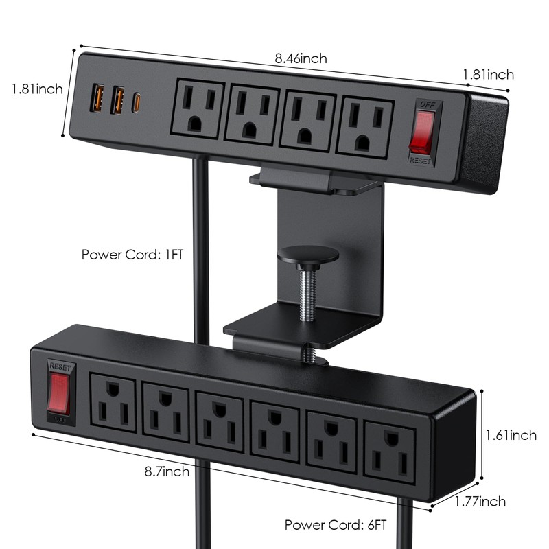 - 【Desk Clamp Power Strip with Surge Protection】 - Constructed from fire-resistant ABS plastic, this power strip offers a 700-Joule surge protection rating with a built-in circuit breaker to guard against overloads, short circuits, and overheating. Effectively handles voltage spikes to keep your computer and other accessories safe.