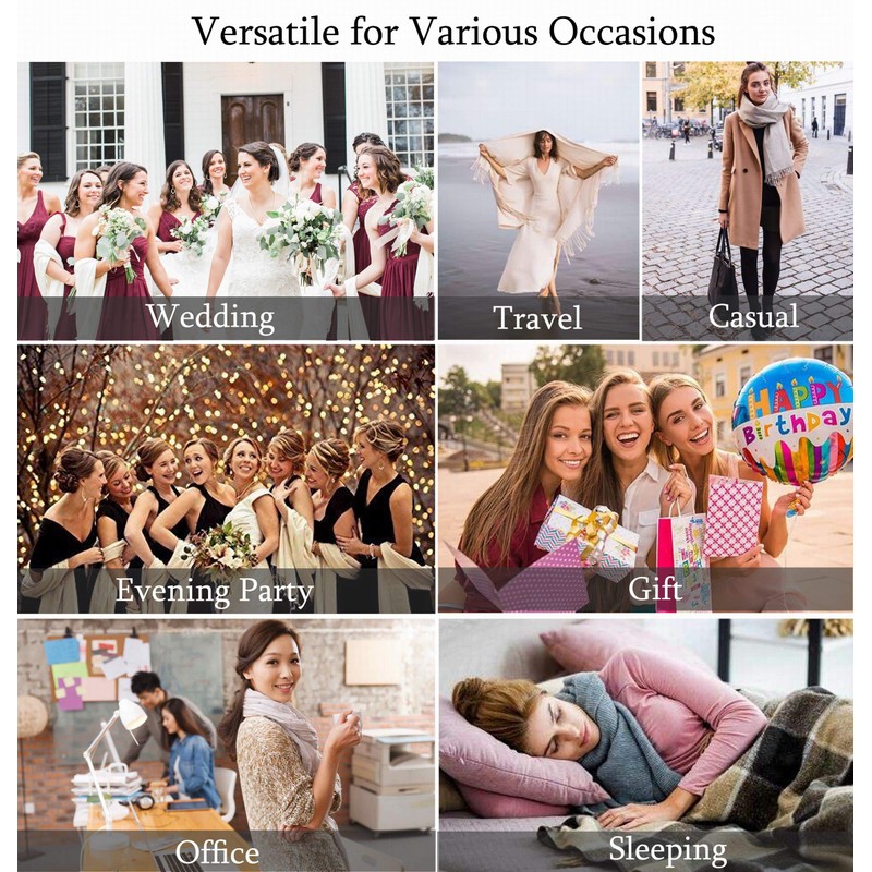 - ►【Multi-functional】- Our pashmina scarves are available in versatile and different colours to choose from, for different occasions, such as wedding, birthday party, evening events, easily matched with your coats, jackets, sweaters or dresses; it is not only suitable for cold weather, but also for cool summer evenings as a pashmina blanket or air-conditioned places (office, church, plane, theatre, restaurant and cruise travel)