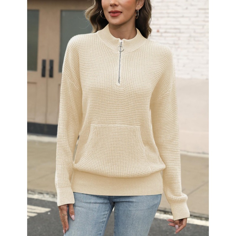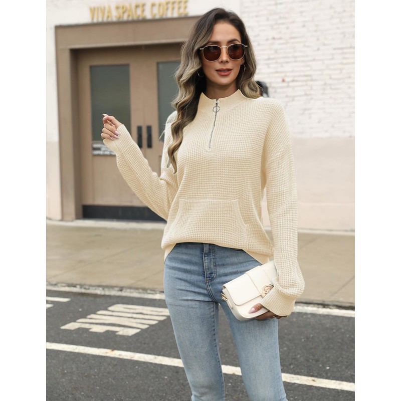 VIMPUNEC Womens 2025 Fall Mock Neck Pullover Quarter Zip Waffle Knit Long Sleeve Casual Sweater Top Outfit Apricot S
