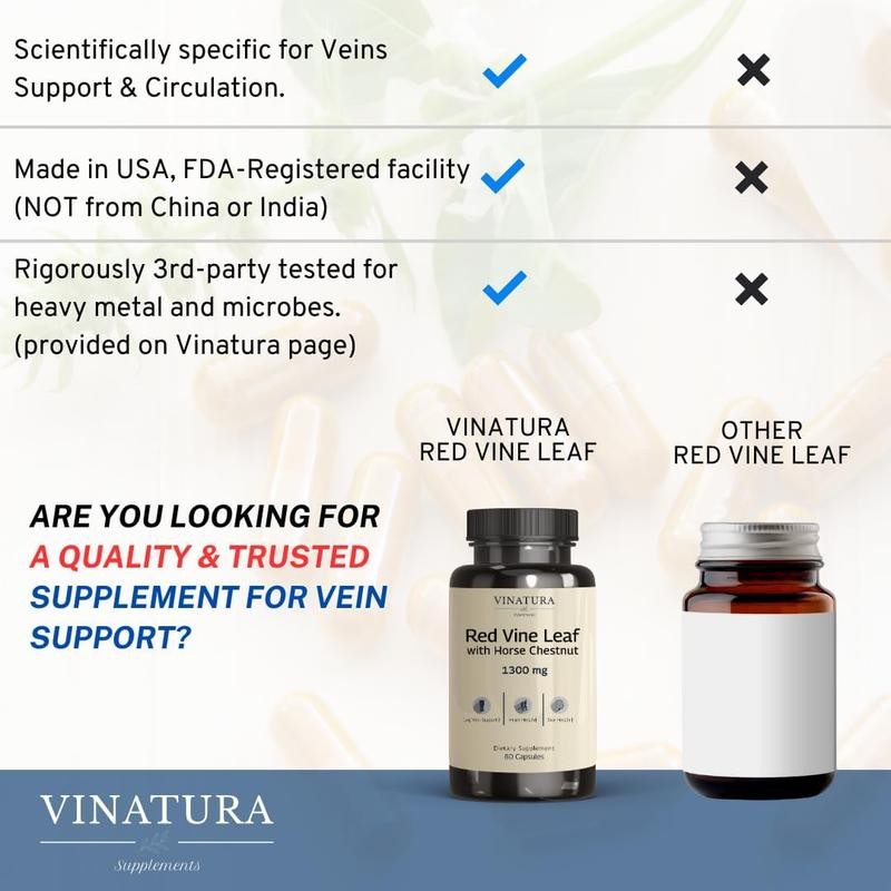 VINATURA Red Vine Leaf Extract - Horse Chestnut, 1300mg/serving *USA Made and Tested* Circulation and Vein Support for Healthy Legs - Helps Blood Flow, Leg Circulation - 60 Capsules (30 Servings) Healthcare, Dietary Supplement